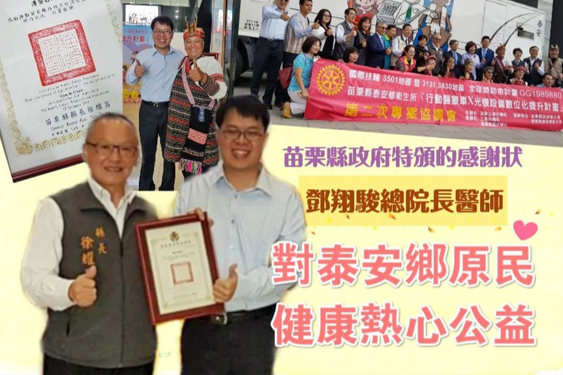 The Miaoli County Government presenting a certificate of appreciation to the Company’s Chief Dean Dr. Deng Xiang-jun for the long-term provision of free, quality medical services to indigenous people living in remote areas.