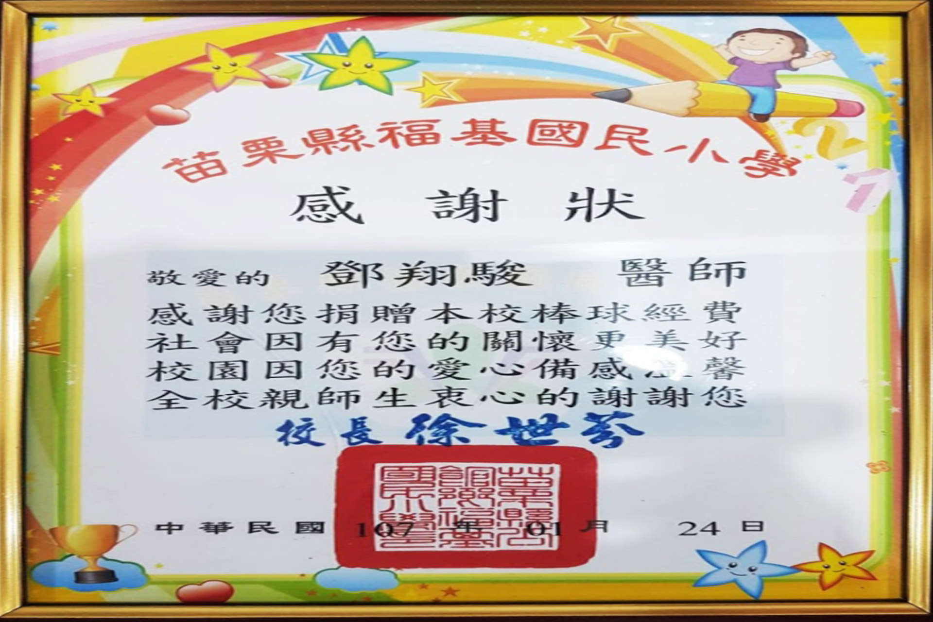 2018—Miaoli County Fuji Elementary School presenting a certificate of appreciation to the Company for funding the training of elementary school baseball and encouraging students to develop their baseball specializations.